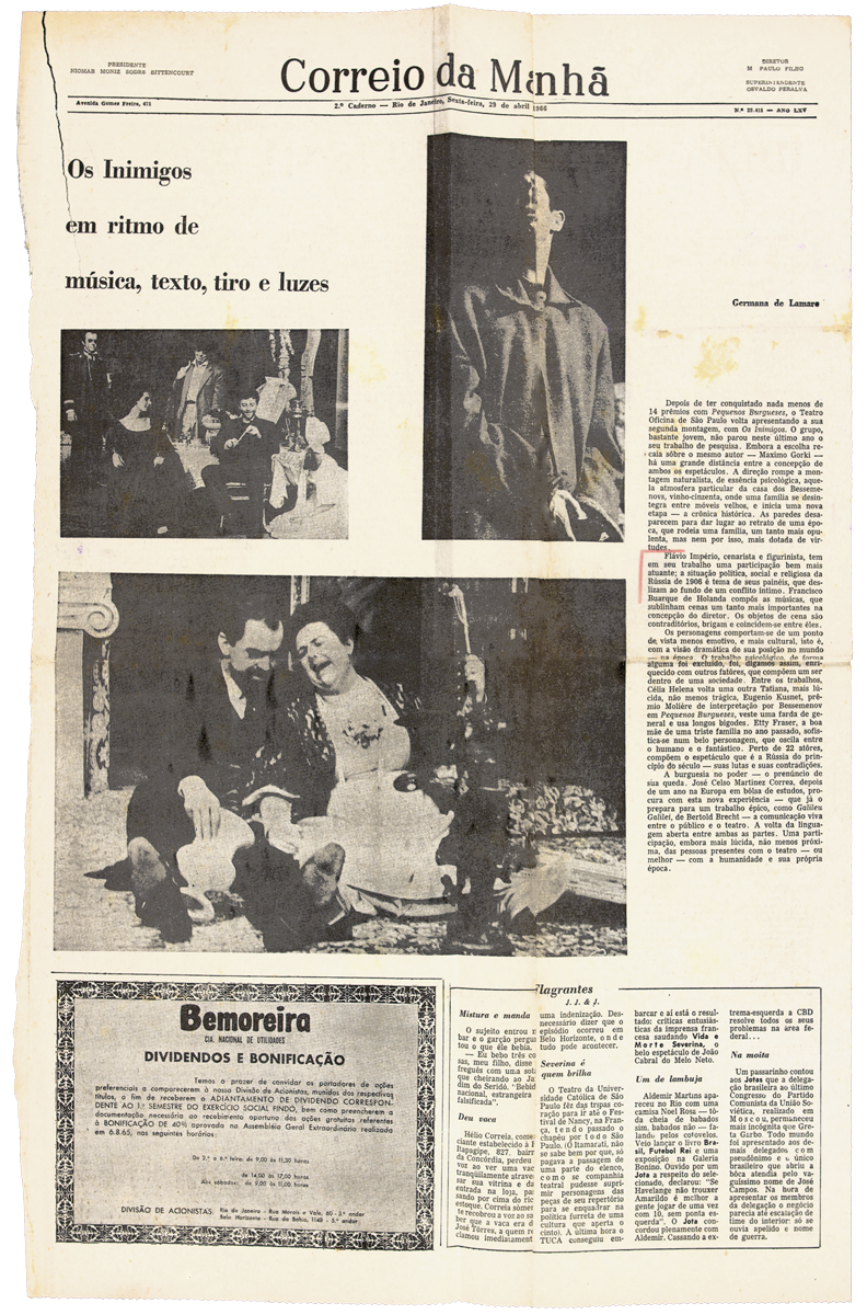 Depois de ter conquistado nada menos de 14 prêmios com Pequenos Burgueses, o Teatro Oficina de São Paulo volta apresetando a sua segunda montagem, com Os Inimigos. O grupo, bastante jovem, não parou neste último ano o seu trabalho de pesquisa. Embora a escolha recaia sobre o mesmo autor – Máximo Gorki – há uma grande distância entre a concepção de ambos os espetáculos. A direção rompe a montagem naturalista, de essência psicológica, aquela atmosfera particular da casa do Bessemenovs, vinho-cnzenta, onde uma família se desintegra entre móveis velhos, e inicia uma nova etapa – a crônica histórica. As paredes desaparecem para das lugar ao retrato de uma época, que rodeia uma família, um tanto mais opulenta, mas nem por isso, mais dotada de virtudes.